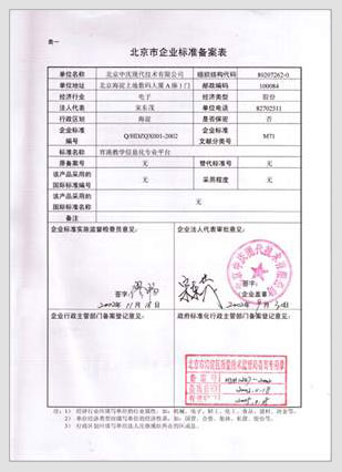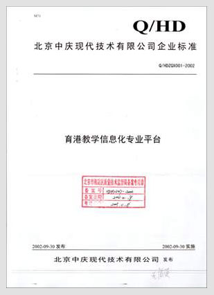 北京中慶現(xiàn)代技術(shù)有限公司企業(yè)標(biāo)準(zhǔn)于2002年11月18日通過北京市質(zhì)量監(jiān)督局的備案。備案號(hào):HDM1247-2002,企業(yè)標(biāo)準(zhǔn)號(hào):Q/HDZQX001-2002。北京中慶現(xiàn)代技術(shù)有限公司的產(chǎn)品“育港教學(xué)信息化專業(yè)平臺(tái)”是同行內(nèi)第一家通過北京市質(zhì)量監(jiān)督局技術(shù)備案的嵌入式計(jì)算機(jī)。
