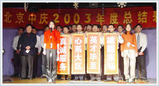 2004年1月18日,北京中慶2003年度總結(jié)表彰大會(huì)暨2004春節(jié)聯(lián)歡會(huì)在位于中關(guān)村高科技園區(qū)上地信息產(chǎn)業(yè)基地的金輝大廈3層成功舉行。