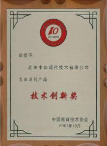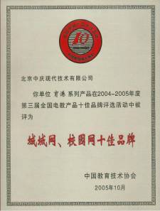 第三屆全國(guó)電教十佳品牌頒獎(jiǎng)儀式于10月30日在四川綿陽(yáng)舉行,現(xiàn)代中慶榮獲第一屆、第二屆十佳品牌之后,蟬聯(lián)榮獲第三屆全國(guó)電教產(chǎn)品十佳品牌。“育港”系列產(chǎn)品在2004—2005年全國(guó)電教產(chǎn)品十佳品牌評(píng)選活動(dòng)中被授予技術(shù)創(chuàng)新獎(jiǎng)。