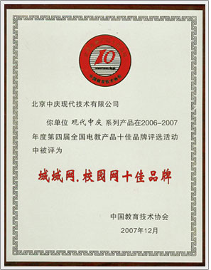 12月2日,在2006—2007年度第四屆全國電教產(chǎn)品十佳品牌評選活動中,現(xiàn)代中慶榮獲全國城域網(wǎng)、校園網(wǎng)十佳品牌稱號。連續(xù)四屆榮獲。