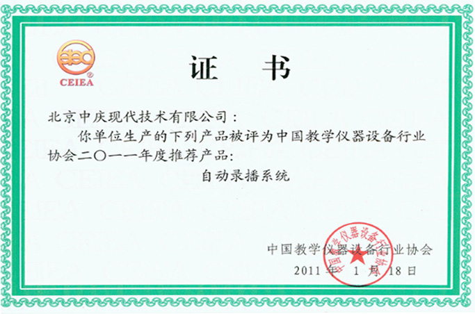 全自動(dòng)錄播系統(tǒng)喜獲中國(guó)教學(xué)儀器設(shè)備行業(yè)協(xié)會(huì)推薦產(chǎn)品。