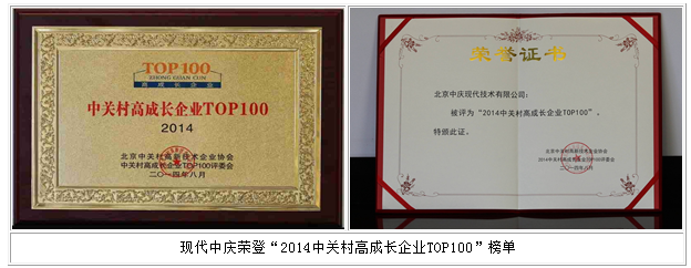 現(xiàn)代中慶榮登“2014中關(guān)村高成長(zhǎng)企業(yè)TOP100”榜單