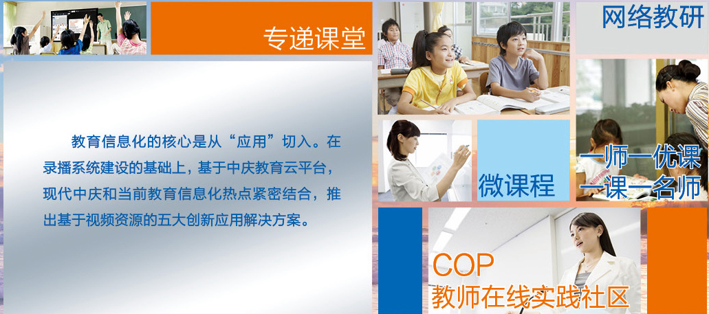 制作微課程是現代中慶挖掘錄播系統深度應用的典型解決方案之一,此外,中慶基于錄播系統和云平臺,還提出了專遞課堂、網絡教研、一師一優課、一課一名師以及教師在線實踐社區等多個解決方案,從實際應用角度落實教育信息化建設,供學校、教育部門參考。
