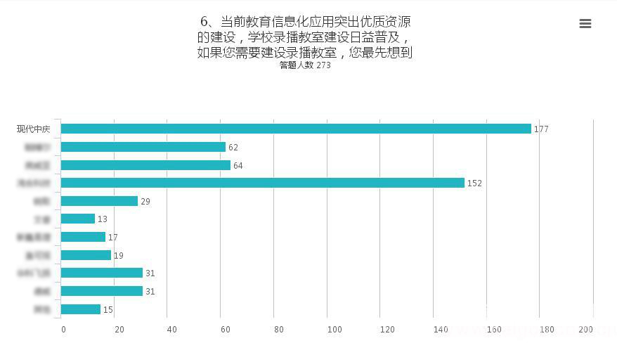 調查結果顯示,當用戶需要建設錄播教室時,現代中慶的品牌傾向最高,有65%的用戶表示在第一時間想到了“中慶”品牌!位居榜首,且遙遙領先,這得益于中慶23年的市場沉淀所積累的用戶信任,也再一次夯實了中慶錄播領頭羊的市場定位!對中慶而言,這是用戶對于中慶專注教育、一心服務教育的最高認可,更是對中慶品牌與中慶品質的雙重肯定! 作為企業,非常感謝用戶的認可!更把這份認可視為一種責任,這份責任督促我們不斷提升和創新。錄播系統,現已逐漸成為校園信息化建設的標準配備。但中慶認為,錄播在當前國內的應用,大概只發揮了三分之一左右的價值,音視頻資源其實還有非常廣闊的應用空間。下一步,中慶將致力于挖掘包含但不限于錄播設備的豐富應用,持續為用戶的購買增值! 關于本次調查 城市教育裝備合作與發展論壇由全國17個城市的教育技術裝備部門共同倡議發起,是一個全國教育裝備行業的權威品牌論壇和頂級年度峰會。本屆論壇吸引了來自北京、上海、南京、廣州、成都、南昌、杭州、呼和浩特、青島、寧波、深圳、廈門、無錫、蘇州等28個城市和區縣的教育技術裝備部門領導和學校負責人近500名,用戶覆蓋面廣,且行業屬性強,足以確保本次調查及數據結果的可靠性。
