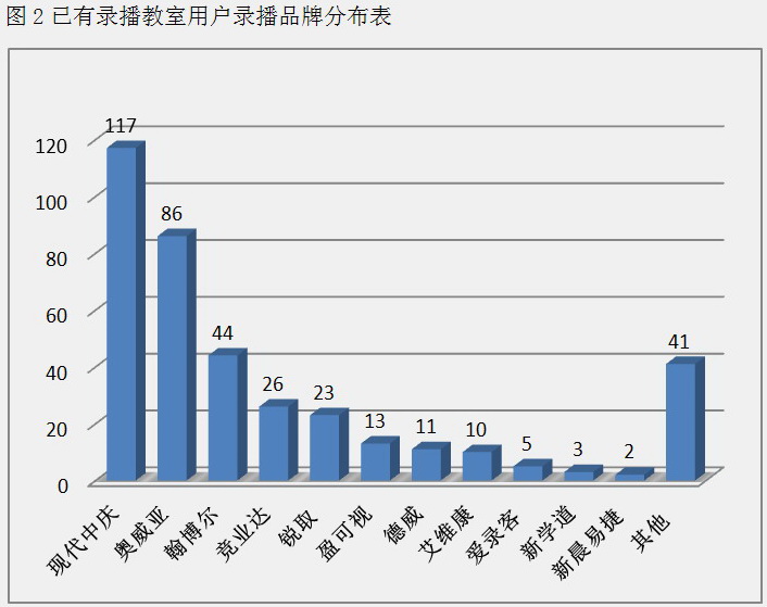 用戶已有錄播系統品牌情況 在對已有錄播教室的用戶所擁有的品牌調查中,現代中慶品牌仍然位居第一,奧威亞排第二,第三至第五分別為翰博爾、競業達和銳取。來自臺灣的品牌愛錄課也贏得了一定的市場份額,未列入問卷中的其他品牌在這里擁有了相對較高的數據。這反映出,在全國市場,領先的一線品牌依然具有較強的實力,但是眾多中小品牌的出現,讓品牌趨向分化,錄播市場的品牌競爭將更加激烈。
