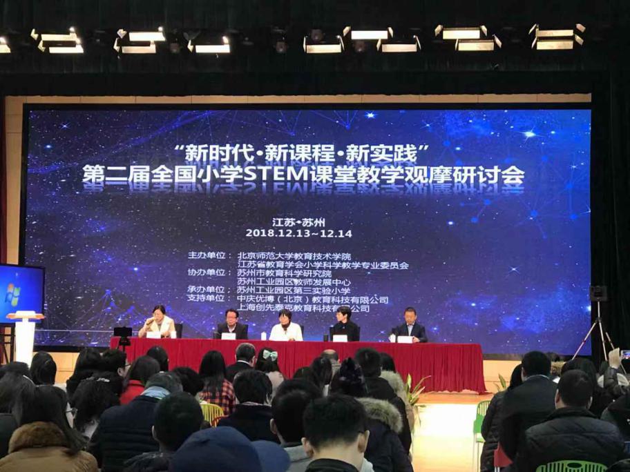 12月13日-14日,由北京師范大學(xué)教育技術(shù)學(xué)院、江蘇省教育學(xué)會(huì)小學(xué)科學(xué)教學(xué)專業(yè)委員會(huì)主辦的第二屆“新時(shí)代·新課程·新實(shí)踐”小學(xué)STEM課堂教學(xué)觀摩研討會(huì)在蘇州工業(yè)園區(qū)第三實(shí)驗(yàn)小學(xué)隆重舉行,共吸引來自全國(guó)360余位專家及教師代表參會(huì)。中慶作為本次研討會(huì)支持單位和唯一指定的STEM教育優(yōu)質(zhì)服務(wù)商,攜STEM教育整體解決方案亮相,完善的STEM教學(xué)體系吸引了眾多參會(huì)教師的熱情詢問和參觀。