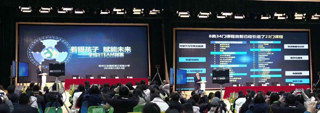 活動(dòng)現(xiàn)場(chǎng)蘇州工業(yè)園區(qū)第三實(shí)驗(yàn)小學(xué)的倪淵、王玉乾、徐步東、張秋佳四位老師分別在兩個(gè)會(huì)場(chǎng)向與會(huì)代表進(jìn)行了STEM的課堂教學(xué)展示活動(dòng)?;顒?dòng)過后,與會(huì)代表參觀了學(xué)校的STEAM中心。
