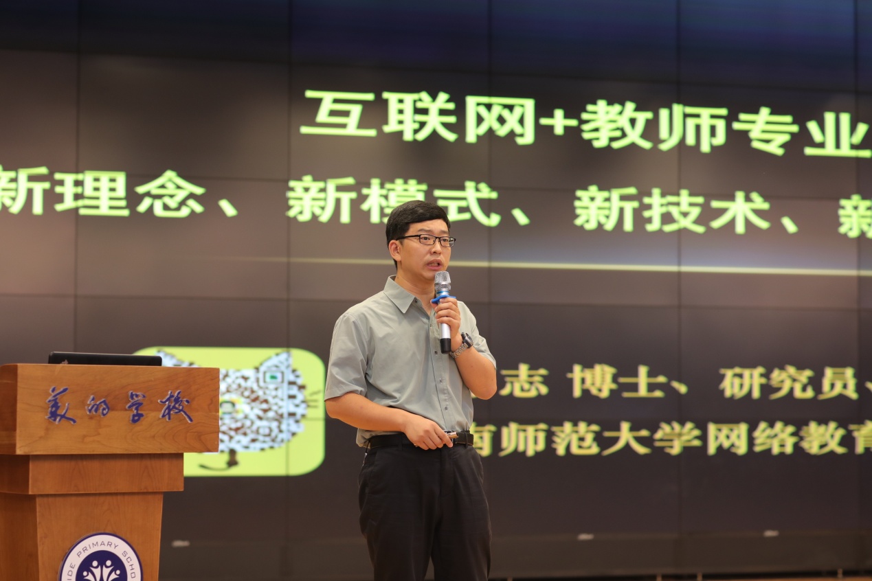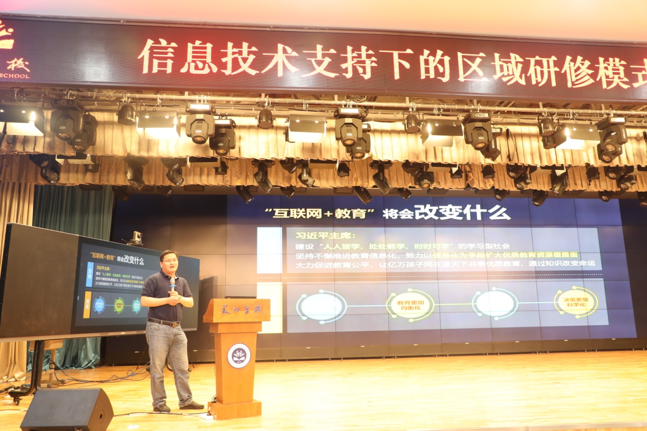 主題報(bào)告中,武麗志從"新理念、新模式、新技術(shù)、新資源、新體系"五個(gè)方面,結(jié)合具體事例,深入淺出地分析了互聯(lián)網(wǎng)時(shí)代的教師專業(yè)發(fā)展的路徑。丁玉祥從"發(fā)展趨勢(shì)、政策依據(jù)、深度理解、個(gè)性選擇、關(guān)鍵路徑"五個(gè)方面對(duì)區(qū)域網(wǎng)絡(luò)研修模式創(chuàng)新和研訓(xùn)方式轉(zhuǎn)型進(jìn)行全方位解讀。荷塘區(qū)教育局黨委書記、局長(zhǎng)韓永斌在主題發(fā)言中介紹了荷塘區(qū)構(gòu)建荷塘教師發(fā)展新常態(tài)的經(jīng)驗(yàn)做法,即破解"三難"、建立"三模"、實(shí)現(xiàn)"三大突破"; 應(yīng)用驅(qū)動(dòng),政企合作,實(shí)現(xiàn)量身定制;示范引領(lǐng),以點(diǎn)帶面,實(shí)現(xiàn)"全員覆蓋"。