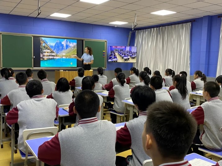 活動中,第九中學(xué)的三位青年教師分別展示語文、數(shù)學(xué)、政治三門精彩的示范觀摩課,授課中全程與尖塔中學(xué)遠(yuǎn)程連線。兩校學(xué)生異地同課,孩子們積極而新奇;局長、校長、教研員、學(xué)科教師全員分別在現(xiàn)場通過網(wǎng)絡(luò)直播觀摩課堂。
