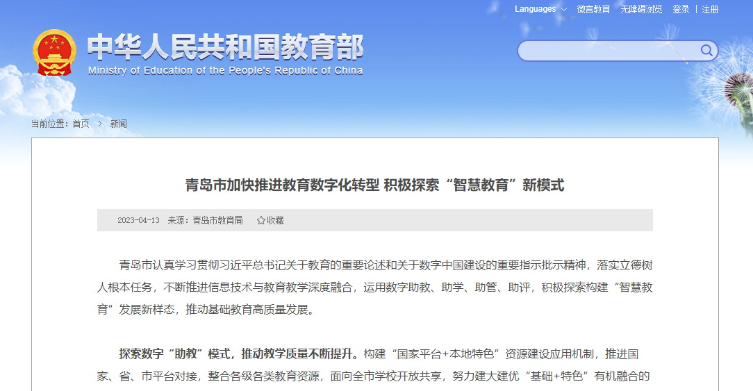 近年來(lái),青島市不斷推進(jìn)信息技術(shù)與教育教學(xué)深度融合,積極探索構(gòu)建“智慧教育”發(fā)展新樣態(tài),推動(dòng)基礎(chǔ)教育高質(zhì)量發(fā)展。教育部網(wǎng)站戰(zhàn)線(xiàn)聯(lián)播欄目以《青島市加快推進(jìn)教育數(shù)字化轉(zhuǎn)型 積極探索“智慧教育”新模式》為題,推廣青島市教育數(shù)字化轉(zhuǎn)型的經(jīng)驗(yàn)做法。