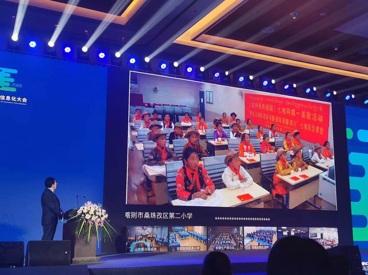 青島嘉峪關(guān)學(xué)校和西藏日喀則、貴州安順、甘肅隴南、四川大涼山、新疆建設(shè)兵團(tuán)、山東菏澤等七地學(xué)生通過(guò)同步課堂“同唱一首歌”