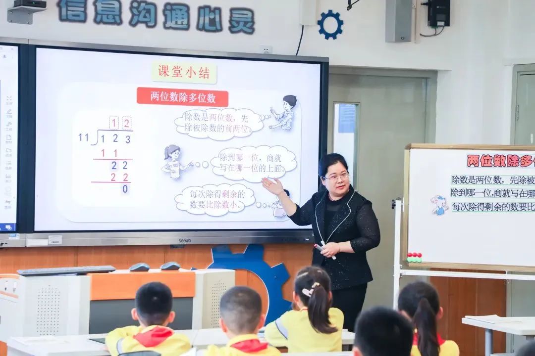 方靚老師作為代表為大家展示了項(xiàng)目組對(duì)于三個(gè)助手的運(yùn)用,呈現(xiàn)《兩位數(shù)除多位數(shù)》的教學(xué)展示課。將整個(gè)教學(xué)細(xì)分為課前、課中、課后3個(gè)環(huán)節(jié)。課前對(duì)本班學(xué)生相關(guān)知識(shí)掌握情況進(jìn)行調(diào)查、分析,確定改進(jìn)的教學(xué)思路;課中通過(guò)備課助手創(chuàng)設(shè)互動(dòng)任務(wù),利用教學(xué)助手讓學(xué)生自主探究;課后通過(guò)后測(cè)進(jìn)行實(shí)證驗(yàn)證本堂課的效果。