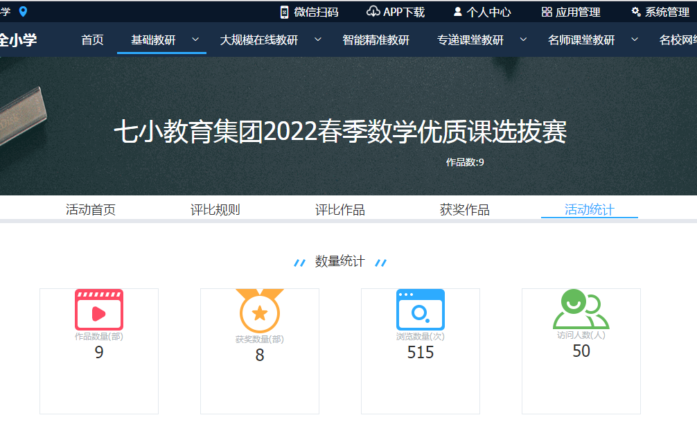 線上比賽分三個(gè)階段進(jìn)行,報(bào)名、評(píng)審、系統(tǒng)自動(dòng)匯總及公布獲獎(jiǎng)名單,均使用的是中央電化教育館智能研修平臺(tái)中“基礎(chǔ)教研”的“優(yōu)課評(píng)選”模塊進(jìn)行。七小集團(tuán)校各分校選派8名教師參加線上技能選拔。線上活動(dòng)平臺(tái),瀏覽數(shù)量達(dá)到515次,包括8名評(píng)委在內(nèi)一共有50名數(shù)學(xué)老師訪問(wèn),參與評(píng)語(yǔ)留言共88條,活動(dòng)達(dá)到滿意的成效。