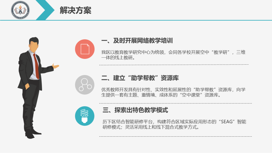 Q1:疫情暴露了線上教研的哪些問題?有哪些解決方案? A:在疫情來襲的時候,歷下區(qū)教體局高度重視并積極響應(yīng)市教育局發(fā)布的《關(guān)于應(yīng)對疫情開設(shè)“空中課堂”服務(wù)學(xué)生的通知》要求,確保“停課不停學(xué),停課不停教”,積極展開線上教研,努力為孩子們創(chuàng)造一個有溫度、負(fù)責(zé)任的學(xué)習(xí)空間。但是近半個學(xué)期的線上學(xué)習(xí)暴露了我們線上教研的一些問題,具體表現(xiàn)為以下幾個困擾上: 01線上教學(xué)設(shè)備的困擾 網(wǎng)絡(luò)教學(xué)迎來的第一輪挑戰(zhàn)就是教學(xué)設(shè)備、教學(xué)軟件的挑戰(zhàn)。由于時間緊迫,教師們只能借助身邊的手機、平板、電腦來上課,可是設(shè)備的新舊程度和容量大小都會制約上課的效果。在軟件選擇上,如果沒有成熟而又穩(wěn)定平臺,遇到故障就會讓老師們直播無法順利地開展。 02學(xué)校原計劃無法有效實施的困擾 突如其來的狀況,讓學(xué)校的教學(xué)系統(tǒng)面臨著前所未有的考驗,一時間原有的教學(xué)計劃無法正常進(jìn)行,課表安排無法順利開展,教師們一開始不知如何應(yīng)對,這讓學(xué)校和教師面臨前所未有的挑戰(zhàn)。如何準(zhǔn)備課程?準(zhǔn)備幾周的課程?理論和實踐計劃如何安排?如何聯(lián)絡(luò)學(xué)生?諸如此類的問題都是疫情帶給教育的困擾。 03教師網(wǎng)絡(luò)教學(xué)經(jīng)驗欠缺 教師信息素養(yǎng)不能完全勝任在線教學(xué)的要求。不但教師對信息技術(shù)掌握程度的參差不齊,多數(shù)教師已經(jīng)具備的信息化教學(xué)能力,主要還是在學(xué)校線下教學(xué)上,要保證線上教學(xué)的效果,必須充分利用信息技術(shù)開展線上教師培訓(xùn),加強線上協(xié)同教研,尤其是多開展實操性強的課例分析,同時開展在線評課等活動,促進(jìn)教師信息素養(yǎng)提升。 解決方案: 01及時開展網(wǎng)絡(luò)教學(xué)培訓(xùn) 我區(qū)以教育教學(xué)研究中心為統(tǒng)領(lǐng),會同各學(xué)校開展空中“教學(xué)研”,三維一體的線上教研,對全體參與網(wǎng)絡(luò)教學(xué)的教師進(jìn)行培訓(xùn)和指導(dǎo),對年齡較大、較難適應(yīng)的教師采用視頻引導(dǎo)、遠(yuǎn)程電腦控制等方式進(jìn)行相關(guān)操作培訓(xùn)。 02建立“助學(xué)幫教”資源庫 濟南市和歷下區(qū)匯集骨干教師,開發(fā)建成了具有針對性、實效性和延展性的“助學(xué)幫教”資源庫。制作了適合中小學(xué)生的微課,向?qū)W生提供了一套有主題、重情境、成體系的“空中課堂”資源庫,這些豐富而優(yōu)秀的教學(xué)資源可在疫情結(jié)束前為學(xué)生提供學(xué)習(xí)指導(dǎo),也達(dá)到了各個學(xué)校之間的資源共享。 03探索出特色教學(xué)模式 在線教研相對傳統(tǒng)教研,互動少、交流少,面對屏幕缺少溫度,反饋渠道也狹窄,缺少了應(yīng)有的活力,我們探索利用信息化教學(xué)平臺、工具和資源,創(chuàng)新性開展教研活動,探索發(fā)展線上線下一體化的交互式、個性化教研。 我們充分結(jié)合區(qū)域獨有學(xué)科特色和實際應(yīng)用需求,以及央館智能研修平臺的特色應(yīng)用,構(gòu)建符合區(qū)域?qū)嶋H應(yīng)用形態(tài)的“SEAG”智能研修模式:“S”代表統(tǒng)整建模(Scaffolding),“E”代表課例打磨(Exploring),“A”代表多維評估(Assessing),“G”代表資源生成(Generating)。這套研修模式把傳統(tǒng)線下教研與線上教研進(jìn)行有機融合,確保教師疫情期間也能進(jìn)行線上教研,與傳統(tǒng)課堂教學(xué)做好銜接,靈活采用線上和線下混合式教學(xué)方式進(jìn)行授課。 下一步我們會就疫情期間暴露出來的問題做出進(jìn)一步調(diào)研和總結(jié),展開更深入的教研,學(xué)習(xí)先進(jìn)經(jīng)驗,逐步形成更科學(xué)合理的問題解決方案。