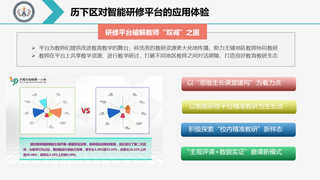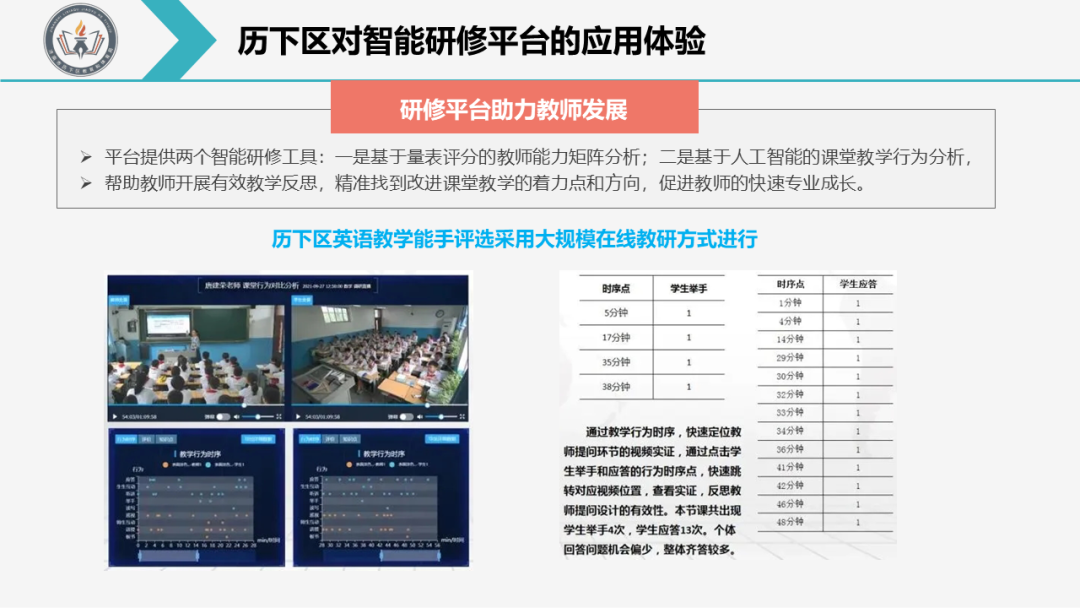 Q4:作為試點工作區(qū)對智能研修平臺的應(yīng)用體驗? A:人工智能“高大上”、信息技術(shù)“略抽象”,但細(xì)細(xì)品來發(fā)現(xiàn),她如同老友,盼望已久,尤其是對于年輕教師來講,可謂是雪中送炭、錦上添花??萍贾?,快速提升教師自身專業(yè)發(fā)展是我們求之不得的事情。 央館智能研修平臺聚焦“人工智能+教師教育”,為實現(xiàn)教師精準(zhǔn)教研提供支撐,形成更多可視化、可量化的教研材料,為提升教師專業(yè)成長加油助力。我們的體驗是: 01為教師發(fā)展助力 平臺提供的兩個智能研修工具,一是基于量表評分的教師能力矩陣分析,可直觀呈現(xiàn)教師能力的多維度評測結(jié)果;二是基于人工智能的課堂教學(xué)行為分析,即平臺利用AI課堂分析評測系統(tǒng)自動識別四種教師和五種學(xué)生行為,包括講授、板書、聽講、舉手、應(yīng)答等,并進(jìn)一步從六個維度對課堂進(jìn)行分析和診斷,生成課堂觀察分析報告。教師可以通過“回顧課堂實況錄像+智能分析報告”的方式,開展有效的教學(xué)反思,精準(zhǔn)找到改進(jìn)課堂教學(xué)的著力點和方向,從而促進(jìn)教師的快速專業(yè)成長。 如:歷下區(qū)英語教學(xué)能手評選采用大規(guī)模在線教研方式進(jìn)行,以“同步直播+異步點播”的方式,破解時間和空間的限制影響,基于“歷下區(qū)英語能手課堂觀察量表”促進(jìn)評委教師手機掃碼觀評課,針對課例實施效果進(jìn)行量化打分;平臺自動匯總和統(tǒng)計所有評課意見和量表打分,生成能手參賽教師的教學(xué)能力矩陣和雷達(dá)圖,更加科學(xué)的診斷英語課堂目標(biāo)達(dá)成度、各項任務(wù)分配是否合理、英語課堂教學(xué)策略是否有效。通過目標(biāo)達(dá)成熱區(qū)圖我們聚焦量表指標(biāo)的達(dá)成度,從而為評委教師客觀評分提供數(shù)據(jù)支撐。