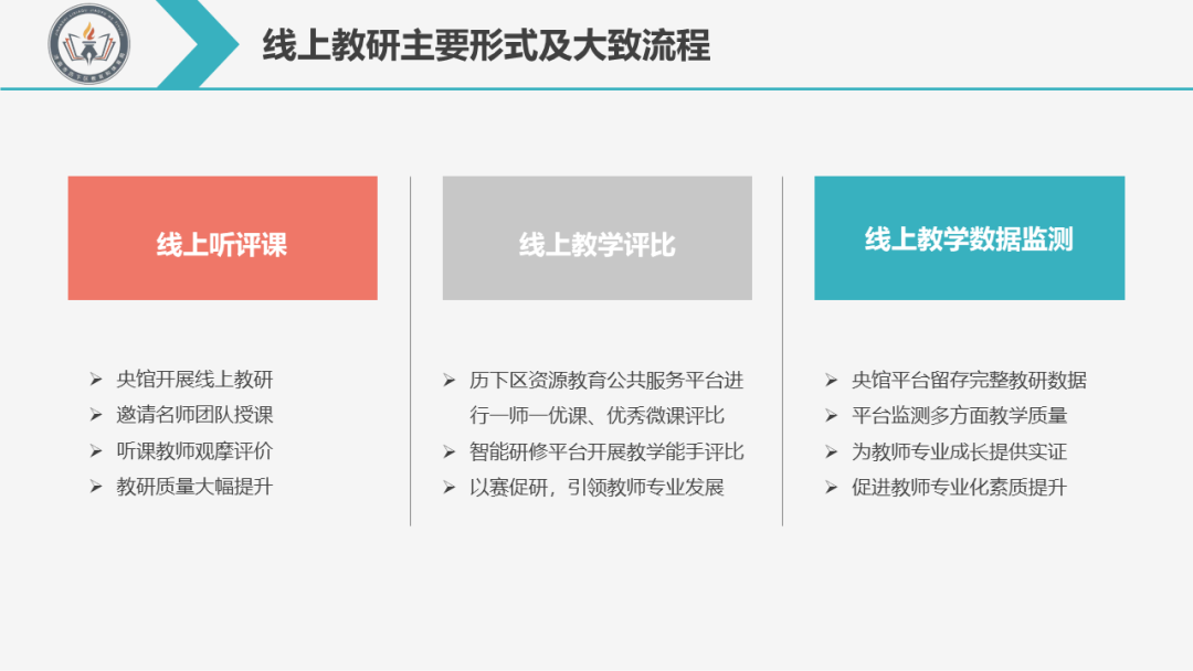 Q2:線上教研主要有哪些形式?大致流程是什么樣的? A:我們目前的線上教研主要有以下幾種方式: 01線上聽評課 組織教師們參加各級網(wǎng)絡(luò)直播教研會議,觀看視頻,發(fā)表評論和學(xué)習(xí)心得。尤其是近期利用中央電教館智能研修平臺開展大規(guī)模在線教研,邀請不同的名師團隊進(jìn)行授課,教師邊觀摩邊發(fā)表評論,還可以給上課教師留言提出意見和建議,結(jié)合平臺自動生成的各項圖表和數(shù)據(jù),對本課內(nèi)容進(jìn)行更深入細(xì)致的評價,并結(jié)合聽課量表的各項指標(biāo)進(jìn)行打分,形成更客觀的評價。授課教師或者教研團隊,也會根據(jù)平臺的圖表數(shù)據(jù),聽課教師的評論意見和打分等,進(jìn)行反思總結(jié),多輪打磨,教研的質(zhì)量有了很大的提升。 02線上教學(xué)評比 我們通過歷下區(qū)教育資源公共服務(wù)平臺上傳各項教育資源和課例,特別是開展了“一師一優(yōu)課”和優(yōu)秀微課的評比,學(xué)校推薦優(yōu)秀課例參加區(qū)級評比,區(qū)里選拔參加市里和省里的評比。我們還利用央館智能研修平臺進(jìn)行了區(qū)小學(xué)英語學(xué)科教學(xué)能手的評比,實驗學(xué)校的老師作為網(wǎng)絡(luò)評委,通過大規(guī)模在線教研,各個教師將自己的上課視頻和課件傳至央館智能研修平臺的各個線上教研組,由其他學(xué)校的教師在線上進(jìn)行打分和評比,作為本次評比的一項依據(jù),從而選出教學(xué)能手,這樣的評比達(dá)到了以賽促研,引領(lǐng)教師專業(yè)發(fā)展的目的。 03線上教學(xué)數(shù)據(jù)監(jiān)測 教師們在用央館智能研修平臺進(jìn)行在線備課磨課時,整個磨課環(huán)節(jié)、磨課中用到的教學(xué)資源、授課教師的課堂情況以及聽課教師的評價等都會在平臺留存數(shù)據(jù),這樣在一次完整的備課結(jié)束后,無論是授課教師,還是磨課組內(nèi)其他成員,都可以有理有據(jù)對此次磨課與所打磨課程進(jìn)行后續(xù)的監(jiān)測。而對于優(yōu)課評選和大規(guī)模在線聽評課功能,平臺能直接監(jiān)測到參賽教師、聽評課教師的課程效果、課程評價等多方面的教學(xué)質(zhì)量。這些寶貴的數(shù)據(jù)資料都為教師們的專業(yè)成長提供了實證,從而有針對性地促進(jìn)教師專業(yè)化素質(zhì)的提升。 線上教研還屬于新生事物,我們也是在不斷的摸索嘗試,可能還不是很成熟,今后會在不斷的完善現(xiàn)有的教研形式,同時,積極探索新的形式,努力形成具有特色的線上教研模式。