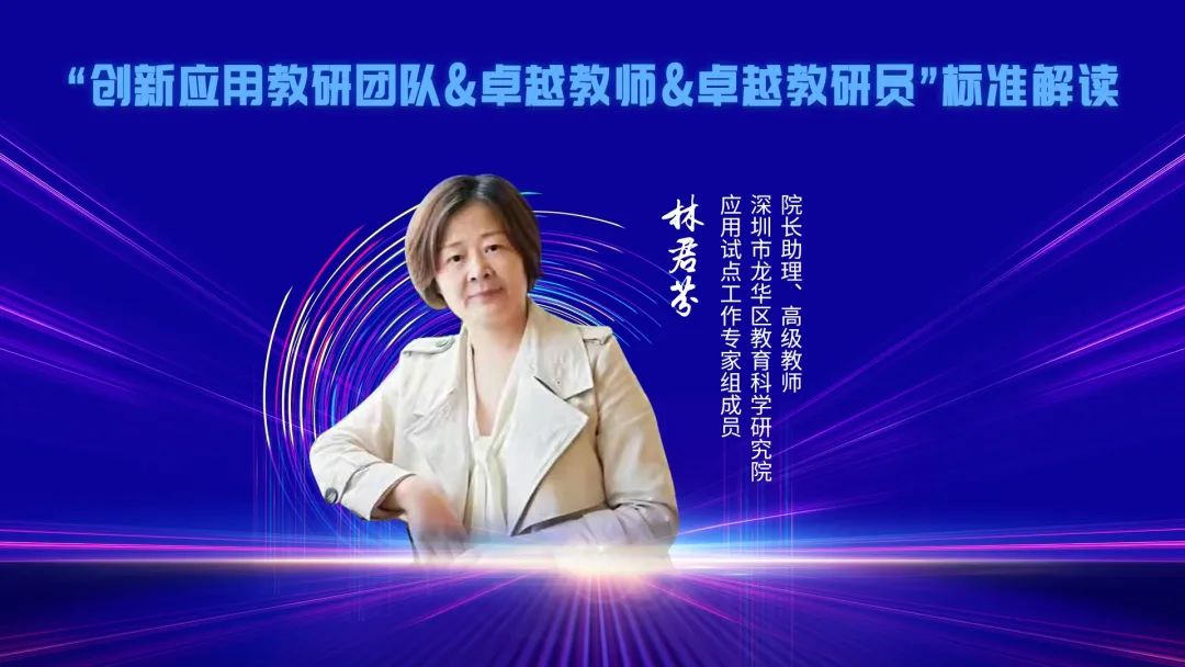 應(yīng)用試點工作專家組成員,深圳市龍華區(qū)教育科學(xué)研究院院長助理、高級教師林君芬對“創(chuàng)新應(yīng)用教研團隊”“卓越教師”“卓越教研員”三個標(biāo)準(zhǔn)進行解讀。林老師指出此次標(biāo)準(zhǔn)制定特別關(guān)注實踐導(dǎo)向,注重參與性、發(fā)展性和示范性,重點回答“做了什么”“做出了什么”“做得怎么樣”。