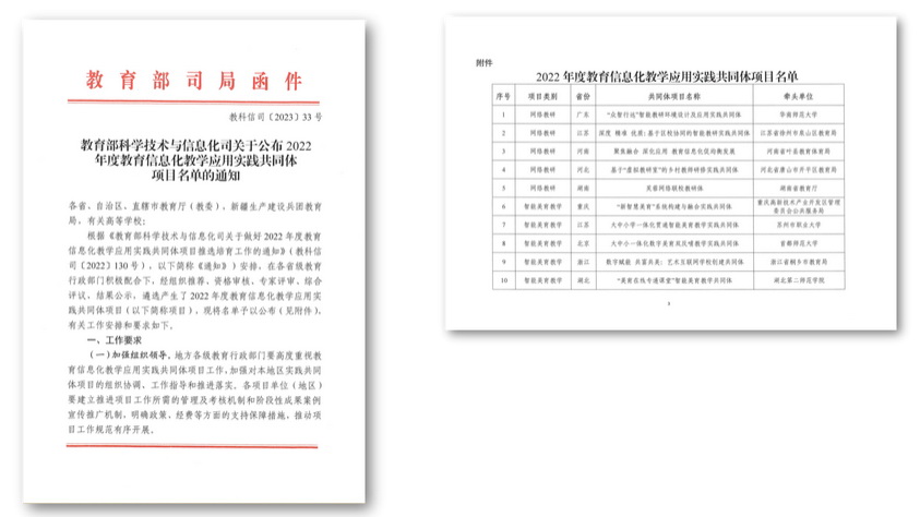 內(nèi)容:2023年4月,教育部科學(xué)技術(shù)與信息化司公布“2022年度教育部信息化教學(xué)應(yīng)用實(shí)踐共同體項(xiàng)目名單”,其中“眾智行遠(yuǎn)”智能教研環(huán)境設(shè)計(jì)及應(yīng)用實(shí)踐共同體和“深度 精準(zhǔn) 優(yōu)質(zhì)”基于區(qū)校協(xié)同的智能教研實(shí)踐共同體兩個(gè)項(xiàng)目入圍,且名列前茅。