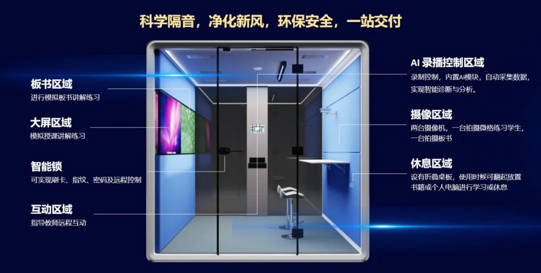 現(xiàn)代中慶AI訓(xùn)練艙具有安靜、私密、隔音的效果,齊全的教學(xué)設(shè)備和錄制環(huán)境,還可以作為微課制作環(huán)境,讓教師一站式、高質(zhì)量完成精品微課資源制作。