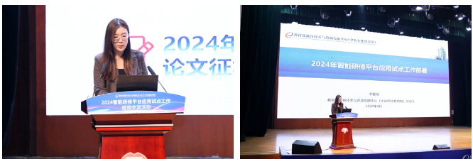 教育部教育技術(shù)與資源發(fā)展中心(中央電化教育館)雜志社編輯,中央電化教育館智能研修平臺應(yīng)用試點工作工作組成員李雅瑄老師,做《2024年智能研修平臺應(yīng)用試點工作部署》。報告圍繞2024年智能研修平臺應(yīng)用試點工作的計劃安排展開,重點解讀《2024年智能研修平臺應(yīng)用論文征集活動》的通知要點,對征集對象、征文主題、行文規(guī)范、報送要求和注意事項等進行細(xì)化和明確,以助推試點區(qū)、試點校、創(chuàng)新應(yīng)用教研團隊、卓越教師、卓越教研員進行成果轉(zhuǎn)化。介紹試點工作應(yīng)用成效調(diào)研方案和第三批領(lǐng)航遴選工作申報要求等。