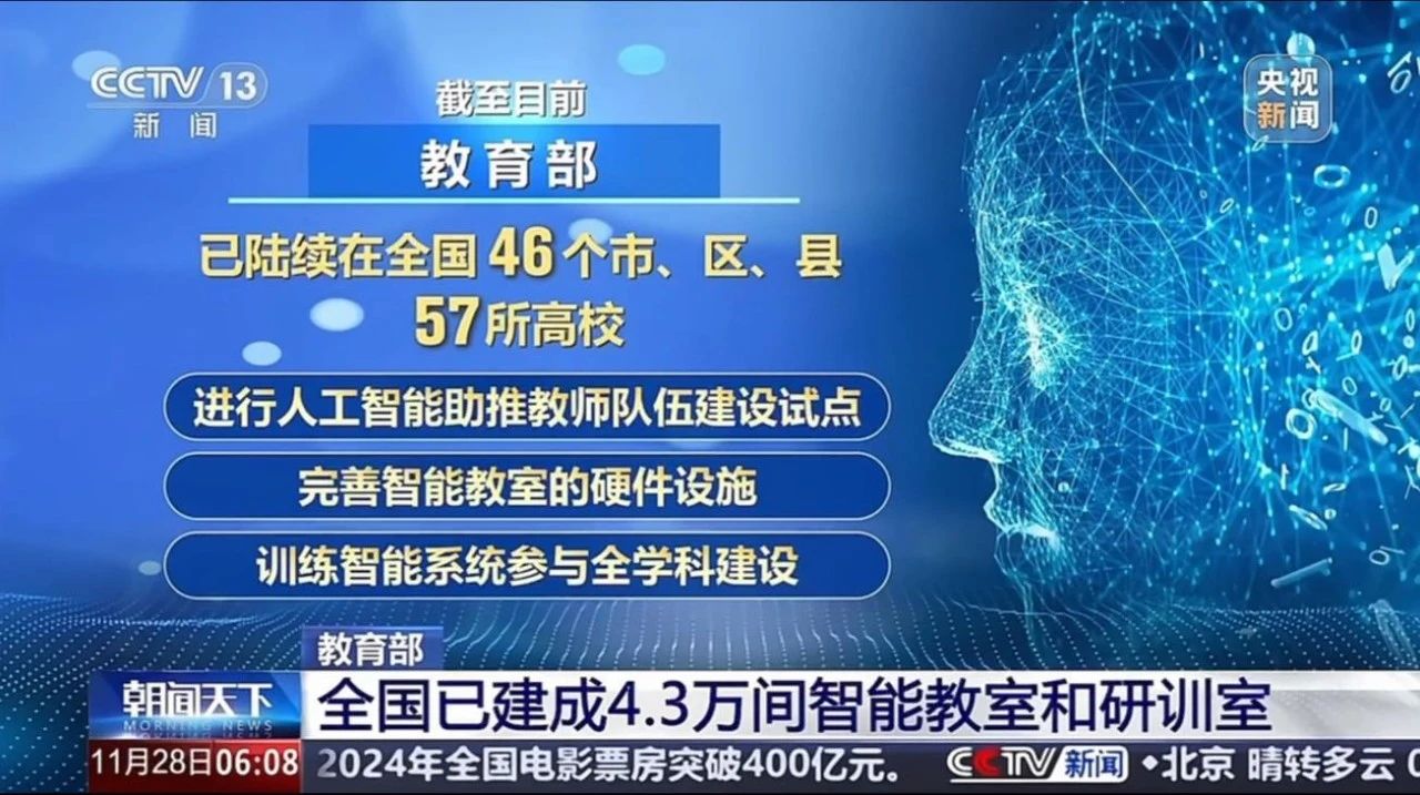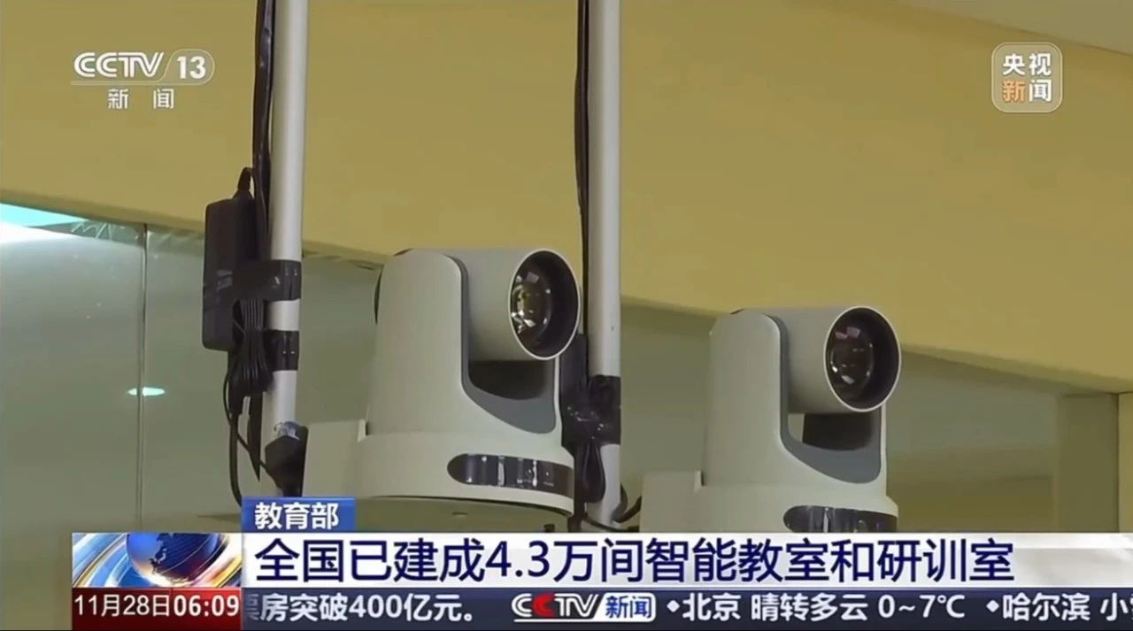 11月28日,中央電視臺《朝聞天下》欄目報(bào)道“全國已建成4.3萬間智能教室和研訓(xùn)室”相關(guān)內(nèi)容。成都市成華區(qū)電子科大附小和英才學(xué)校AI課堂場景在報(bào)道中出現(xiàn),占據(jù)了整個(gè)報(bào)道近四分之一的時(shí)長。