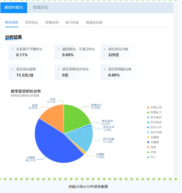 訓(xùn)練中,平臺即時(shí)采集和分析肢體語言、語言表達(dá)、表情應(yīng)用、板書技能和普通話等五大基本技能的訓(xùn)練數(shù)據(jù),并給出深度反饋,做出智能指導(dǎo)。形成從訓(xùn)練、分析、指導(dǎo)到再訓(xùn)練的應(yīng)用閉環(huán),有力支撐靶向改進(jìn)和持續(xù)提升。