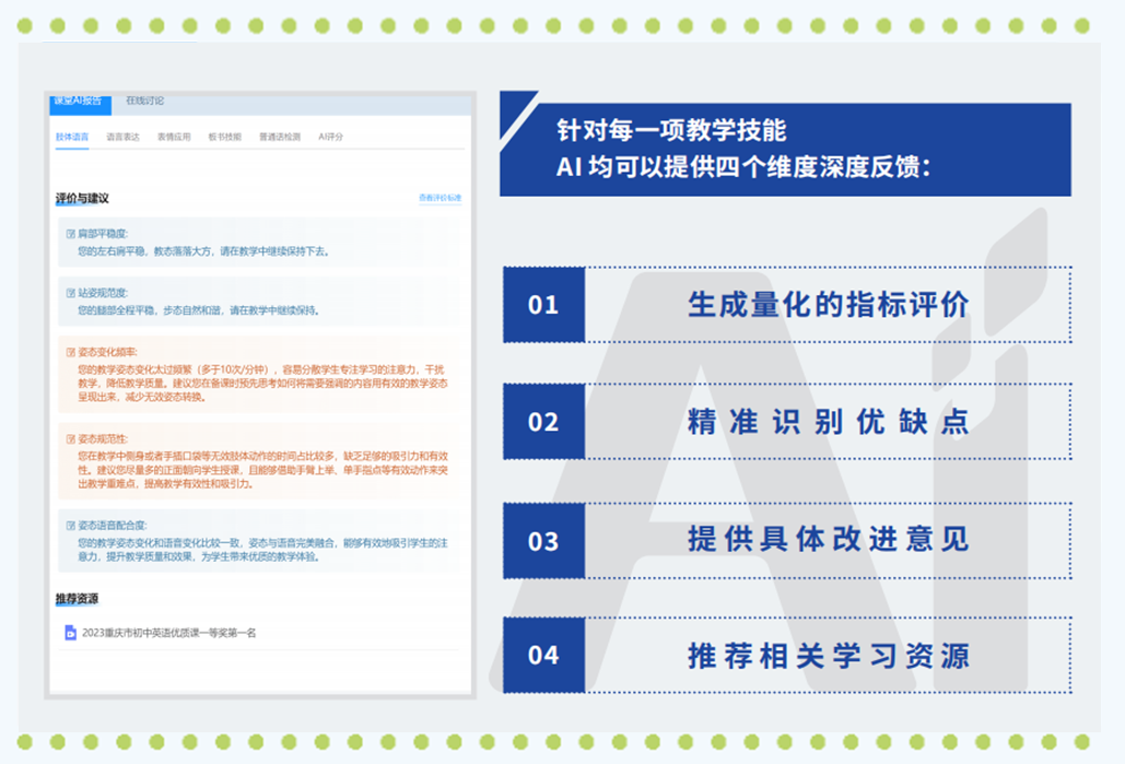 針對每一項(xiàng)技能指標(biāo),AI均可提供評價(jià)、優(yōu)缺點(diǎn)、改進(jìn)意見、推薦學(xué)習(xí)資源四個(gè)維度的深度反饋,有力推動訓(xùn)練師生的靶向改進(jìn)與持續(xù)提升。
