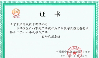 “ 現(xiàn)代中慶”自主研發(fā)的全自動(dòng)錄播系統(tǒng)喜獲中國(guó)教學(xué)儀器設(shè)備行業(yè)協(xié)會(huì)推薦產(chǎn)品。 -