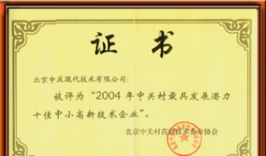 3月10日,“2004年中關(guān)村最具發(fā)展?jié)摿κ阎行「咝录夹g(shù)企業(yè)”推薦活動正式揭曉?,F(xiàn)代中慶獲得此項殊榮,副總經(jīng)理劉禾參加了頒獎儀式。 -
